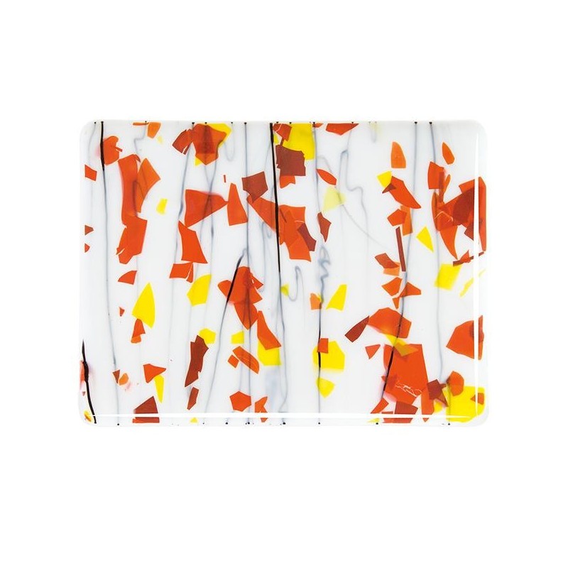 Mélange "Automne" : confettis oranges, jaunes et rouges avec spaghettis noirs sur verre semi transparent.