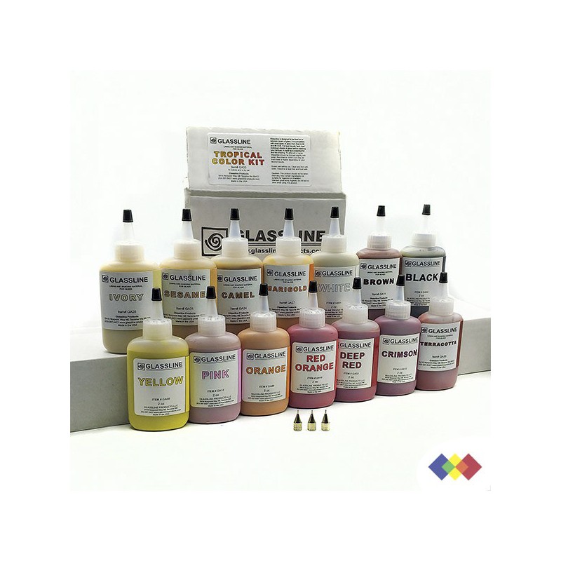 Le kit Glassline tropical est livré avec les quatorze crayons standards de 56 g de couleur : blanc, noir, jaune, jaune doré, orange, orange-rouge, rouge intense, terre cuite, marron, poil de chameau, sésame, ivoire, rose, bordeaux; et un jeu de trois embouts (réf. G16).